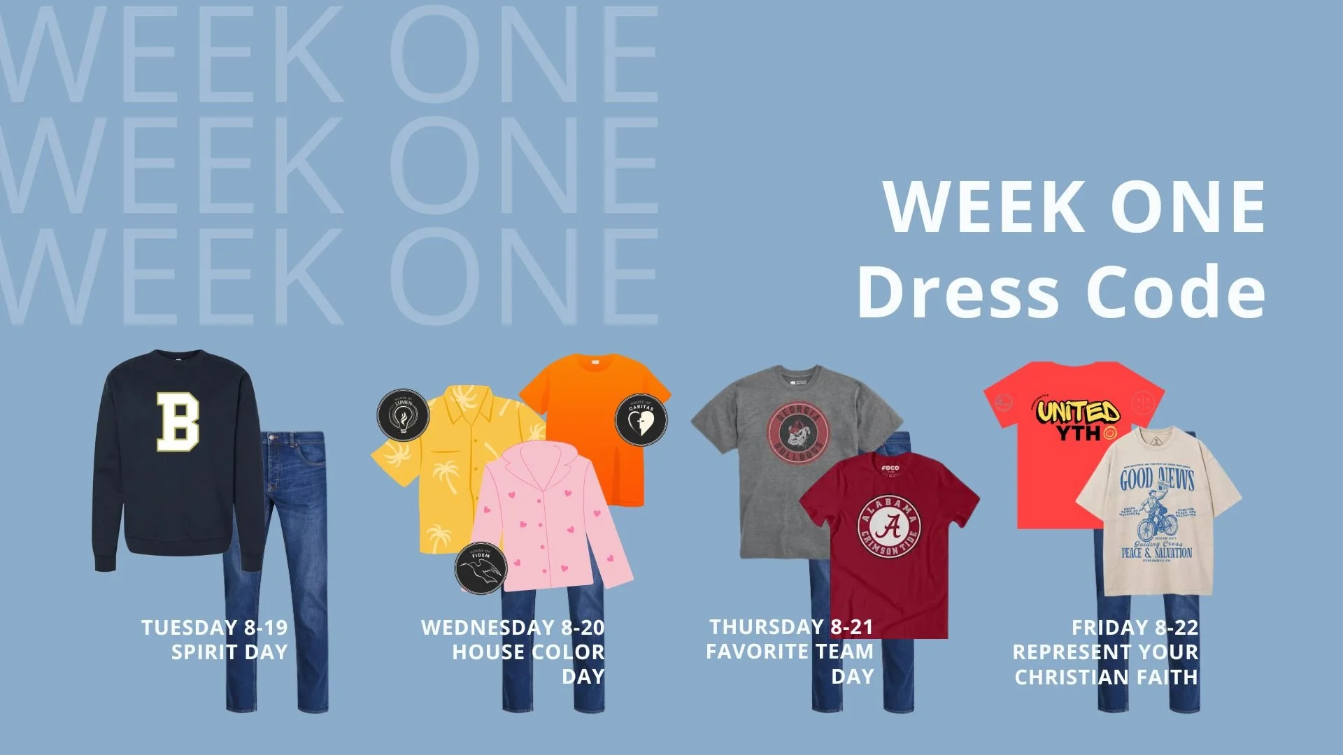 Friday, August 22 – Christian Faith Day (christian shirt, church shirt, or school uniform).