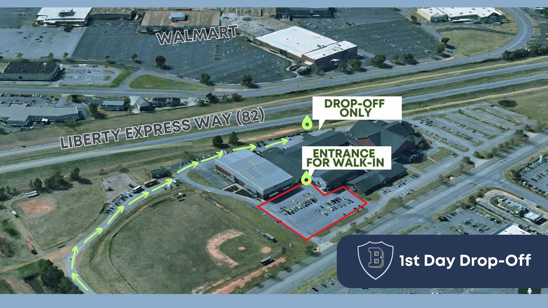 Drop-Off Without Walking In: Enter through the ballfields and follow the route around to the Highway 82 portico for student drop-off. Please have your child unbuckled and ready to exit your vehicle before reaching the portico, and remain in your car to keep the line moving smoothly.